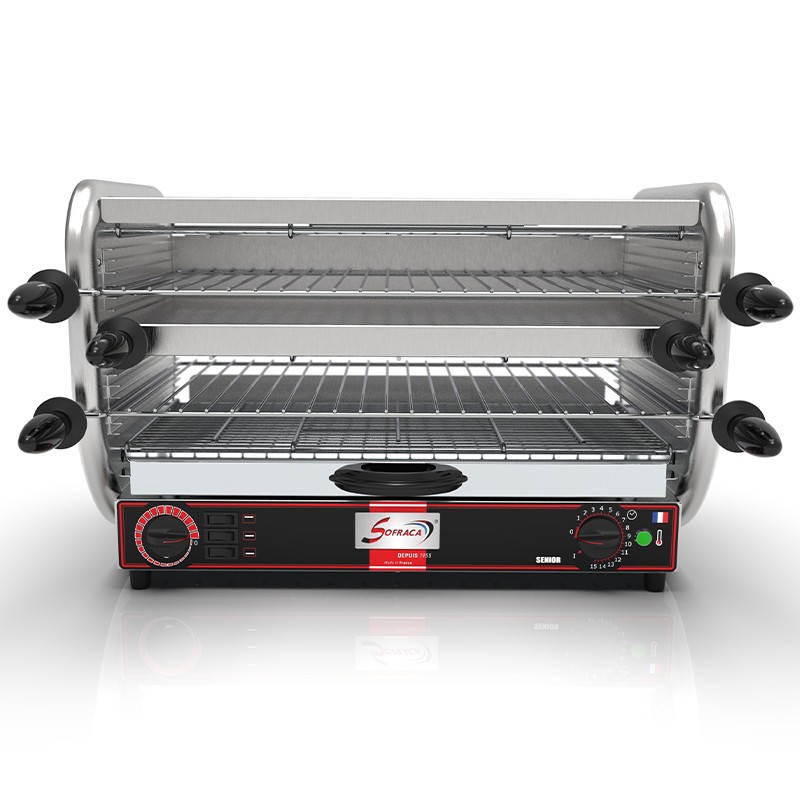 SOFRACA, fabricant français spécialisé dans les équipements de cuisson rapide et de préparation thermique, développe depuis plusieurs décennies des gammes professionnelles destinées aux environnements CHR soumis à des volumes importants et à des contraintes continues. La série TOAST.O.MATIC® Senior fait partie des produits emblématiques de la marque, connus pour leur longévité, la qualité de leurs résistances quartz et la stabilité de chauffe. Les appareils sont conçus pour s’intégrer dans les cuisines où la vitesse d’exécution, la répétabilité et la simplicité d’entretien priment sur les éléments esthétiques superflus.