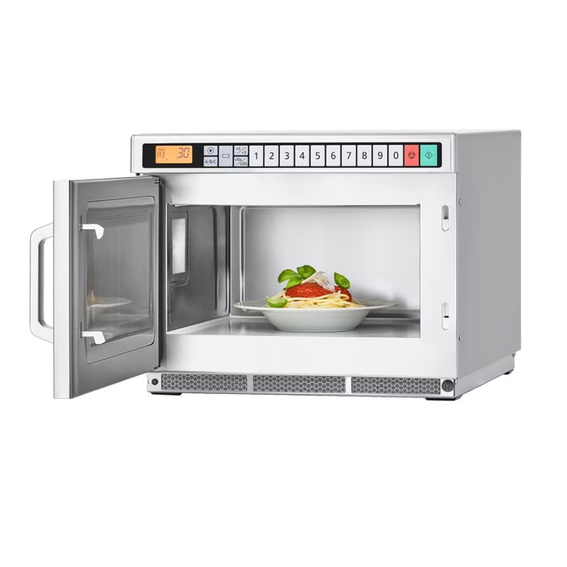 Le four micro-ondes professionnel 1800 W signé Panasonic s’adresse aux établissements de restauration rapide, hôtels, brasseries et collectivités nécessitant un équipement performant pour le réchauffage rapide et homogène des plats. Compact, robuste et conçu pour un usage intensif, il offre un excellent équilibre entre puissance et fiabilité. Grâce à son volume de 18 litres et sa puissance de 1800 W, il garantit une montée en température efficace, même lors de services prolongés. Le panneau à commandes digitales simplifie la gestion des cuissons et permet d’enregistrer jusqu’à 30 programmes pour un gain de temps appréciable en cuisine professionnelle. Fabriqué en inox, tant au niveau de la cuve que de la carrosserie, ce micro-ondes résiste aux contraintes d’un usage quotidien et s’entretient aisément. Il est compatible avec les bacs GN 1/2 (profondeur 150 mm), rendant le réchauffage des plats standardisé simple et rapide.