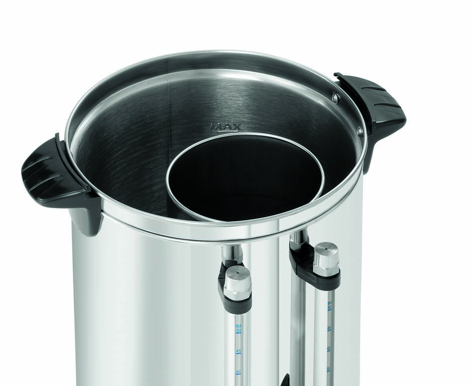 Ce système de distribution d'eau chaude à double paroi est équipé d'un thermostat de sécurité et d'un réglage de température en continu. Avec une puissance de 1.6 kW, il garantit une chauffe rapide et efficace, et offre une plage de température allant jusqu'à 100 °C. Pratique et facile à utiliser, il dispose de deux robinets et d'un indicateur de niveau de remplissage, parfaits pour les environnements professionnels animés. Les matériaux en acier inoxydable assurent durabilité et esthétisme, tandis que l'interrupteur de marche/arrêt simplifie le fonctionnement.