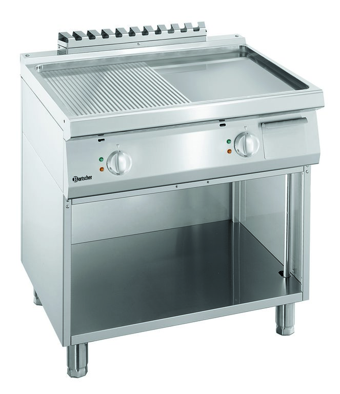 Plaque grill triphasé professionnelle 1 zone lisse 1 zone rainurée sur coffre ouvert - 800x700x850 mm