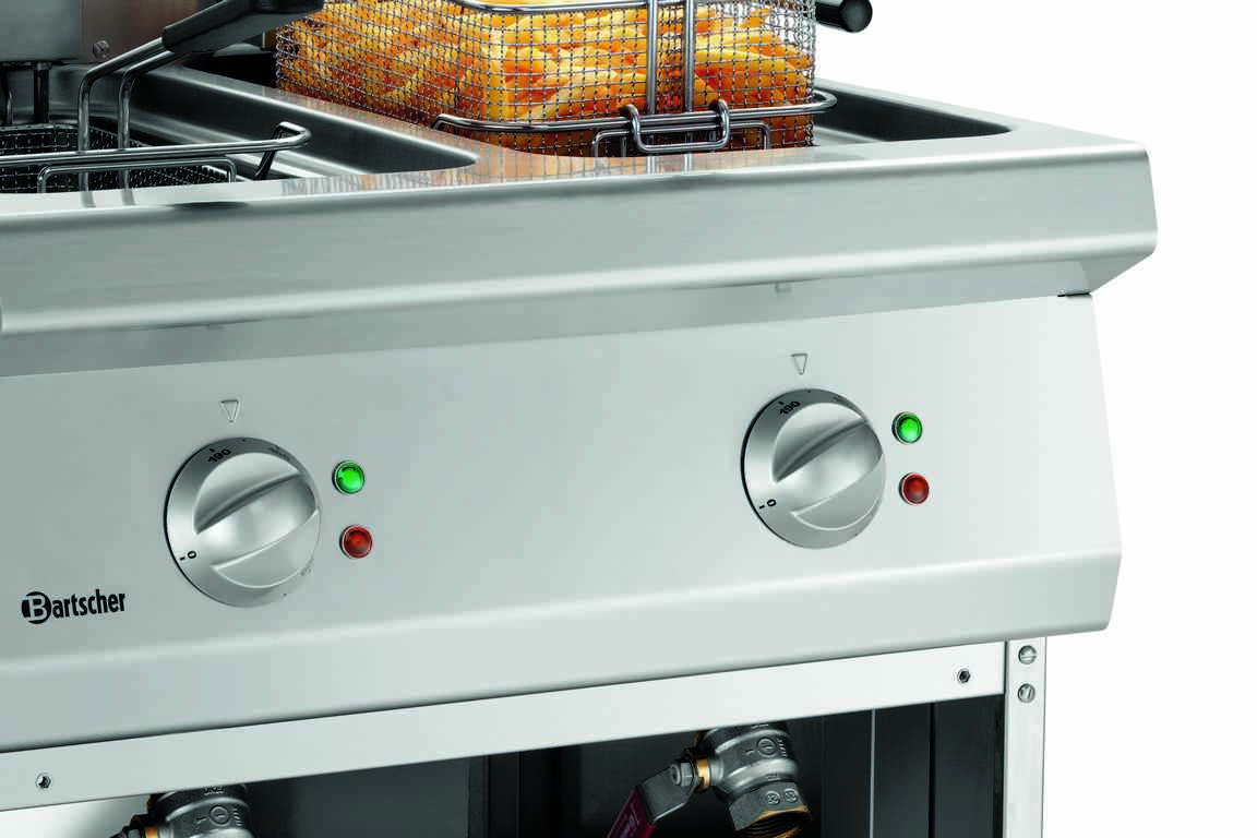 La friteuse électrique sur meuble ouvert 2 cuves Bartscher, avec la référence 286921, est spécialement conçue pour répondre aux besoins des cuisines professionnelles. Grâce à ses deux cuves de 11 litres, elle permet une cuisson optimale et simultanée de grandes quantités, tout en garantissant la maîtrise parfaite de la température grâce à un témoin lumineux de contrôle. Les coins arrondis et le thermostat de sécurité viennent s’ajouter à ses atouts, garantissant un usage facile et sécurisé.