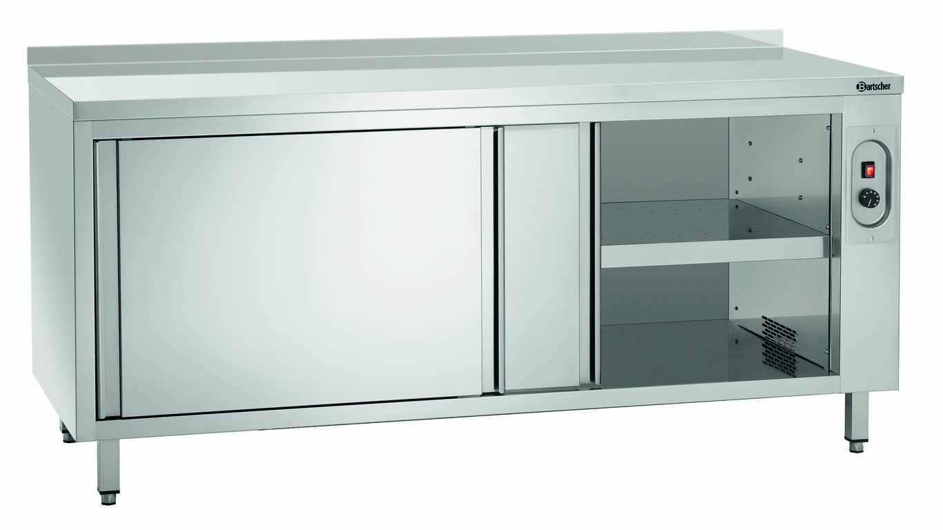 Meuble bas inox chauffant adossé ouvert avec 2 portes coulissantes - 1800x700x850 mm