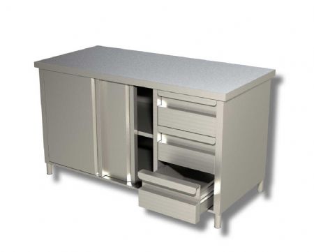 Meuble bas de rangement inox 430 adossé avec 3 tiroirs et 2 portes coulissantes