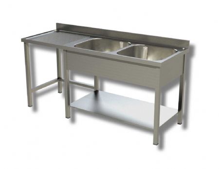 Plonge inox 2 bacs 1 étagère avec dosseret et passage lave vaisselle à gauche - 1600x700x850 mm