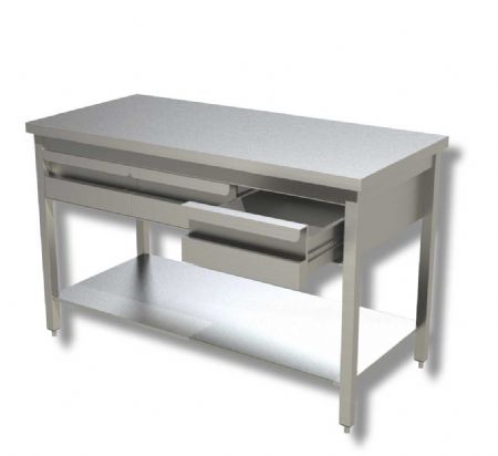 Table de travail inox 430 avec étagère intermédiaire et 3 tiroirs