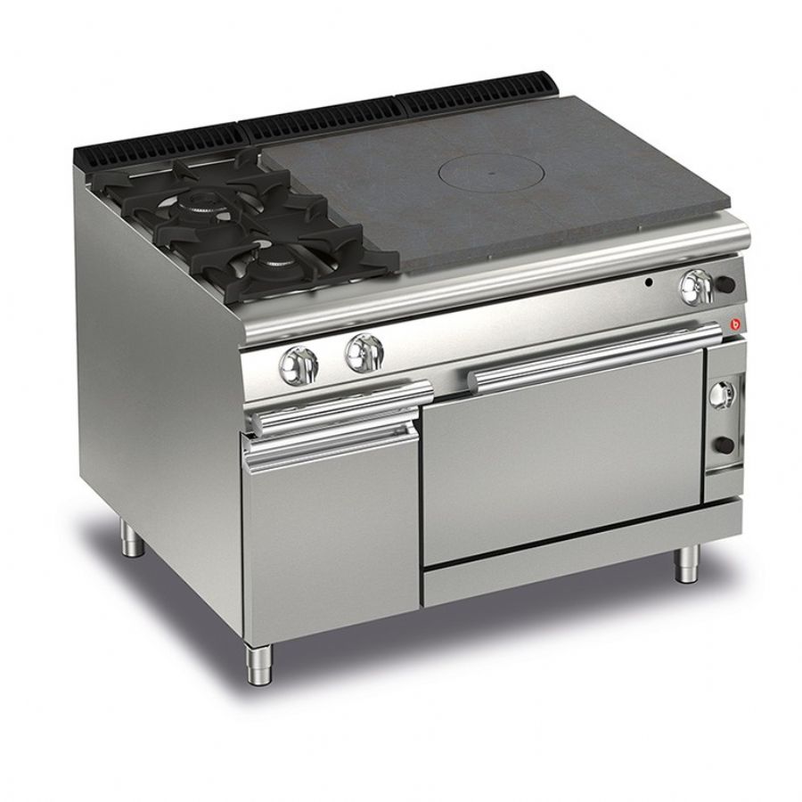 Ce fourneau gaz de cuisine professionnelle développe une puissance totale de 29 kW, répartie entre deux brûleurs vifs de 3,5 et 7 kW, une plaque coup de feu de 12 kW et un four gaz de 6,5 kW. Les brûleurs en fonte à flamme stabilisée, équipés de veilleuse et thermocouple, reposent sur des grilles en fonte émaillée de 400 x 270 mm. La plaque coup de feu en fonte polie de 790 x 550 mm, avec rond central amovible, assure une excellente diffusion thermique. Le four gaz thermostatique, réglable de 110 à 330 °C, offre une enceinte de 572 x 580 x 300 mm, idéale pour bacs GN et plaques pâtissières. L’ensemble est contenu dans un châssis inox de 1200x700x870 mm, avec placard fermé.