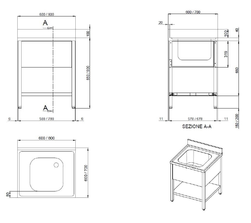 Plonge pro avec étagère démontable 1 bac au centre - 700x700x850mm