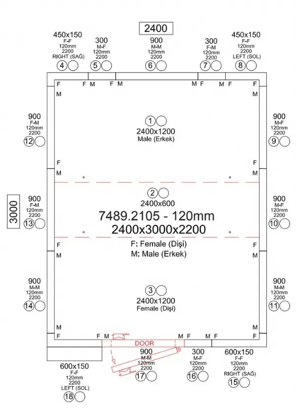 Dimensions extérieures de la chambre (L x P x H) : 2400 x 3000 x 2200 mm