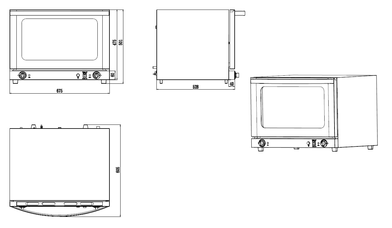 L'installation du four est simplifiée grâce à ses dimensions compactes, 675x600x502 mm, et son poids net de 29 kg. Les professionnels apprécieront l'ergonomie de l'appareil, renforcée par l'utilisation de boutons rotatifs pour une manipulation aisée. L'éclairage interne du four garantit une visibilité optimale, indispensable pour surveiller la cuisson sans ouvrir la porte, préservant ainsi la température interne.