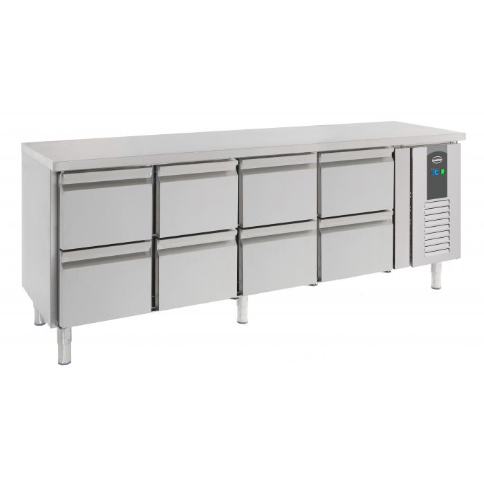 Optimisez votre espace de travail avec le Soubassement réfrigéré 8 tiroirs – R600A – 700 mmConçu pour répondre aux exigences des cuisines professionnelles, ce meuble réfrigéré à tiroirs offre une solution de stockage à la fois pratique, performante et parfaitement adaptée aux environnements intensifs. Grâce à ses 8 tiroirs ergonomiques, il garantit une organisation optimale et une conservation efficace de vos produits frais.