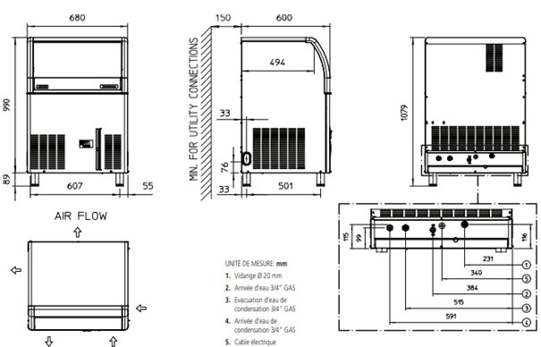 La machine ACM 177 intègre une réserve de 45 kg et peut produire jusqu’à 83 kg de glaçons par jour à 21 °C d’air ambiant. Ses dimensions de 680 x 600 x 990 mm et son poids net de 47 kg en font un appareil compact pour une telle capacité. Elle utilise le gaz réfrigérant R290, reconnu pour ses performances énergétiques et son respect de l’environnement.