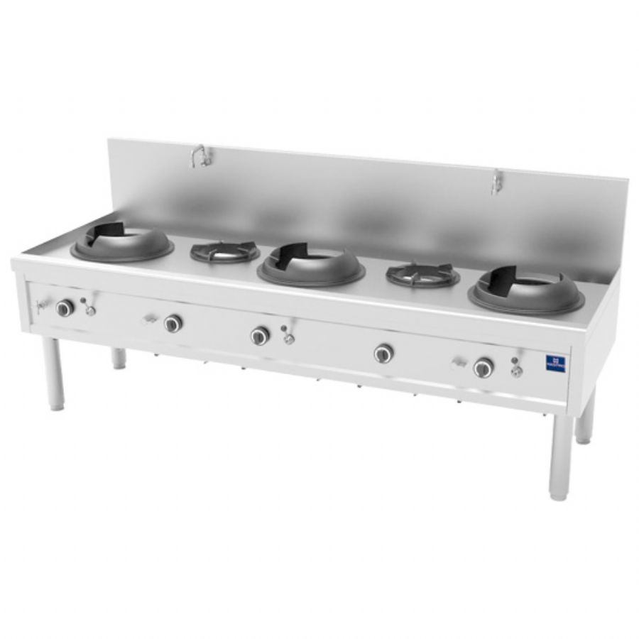 Fourneau wok professionnel à gaz en inox avec 5 feux - 3x 17kW + 2x 9kW