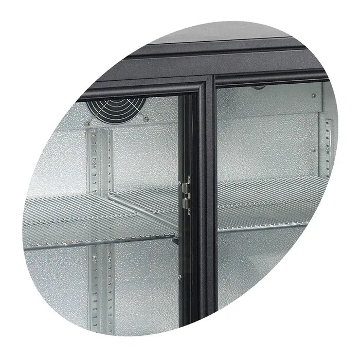 Double vitrage de sécurité, Portes vitrées coulissantes à fermeture automatique, Thermostat électronique facile d’accès, Tablettes ajustables, Pieds ajustables, Éclairage intérieur LED, Refroidissement ventilé