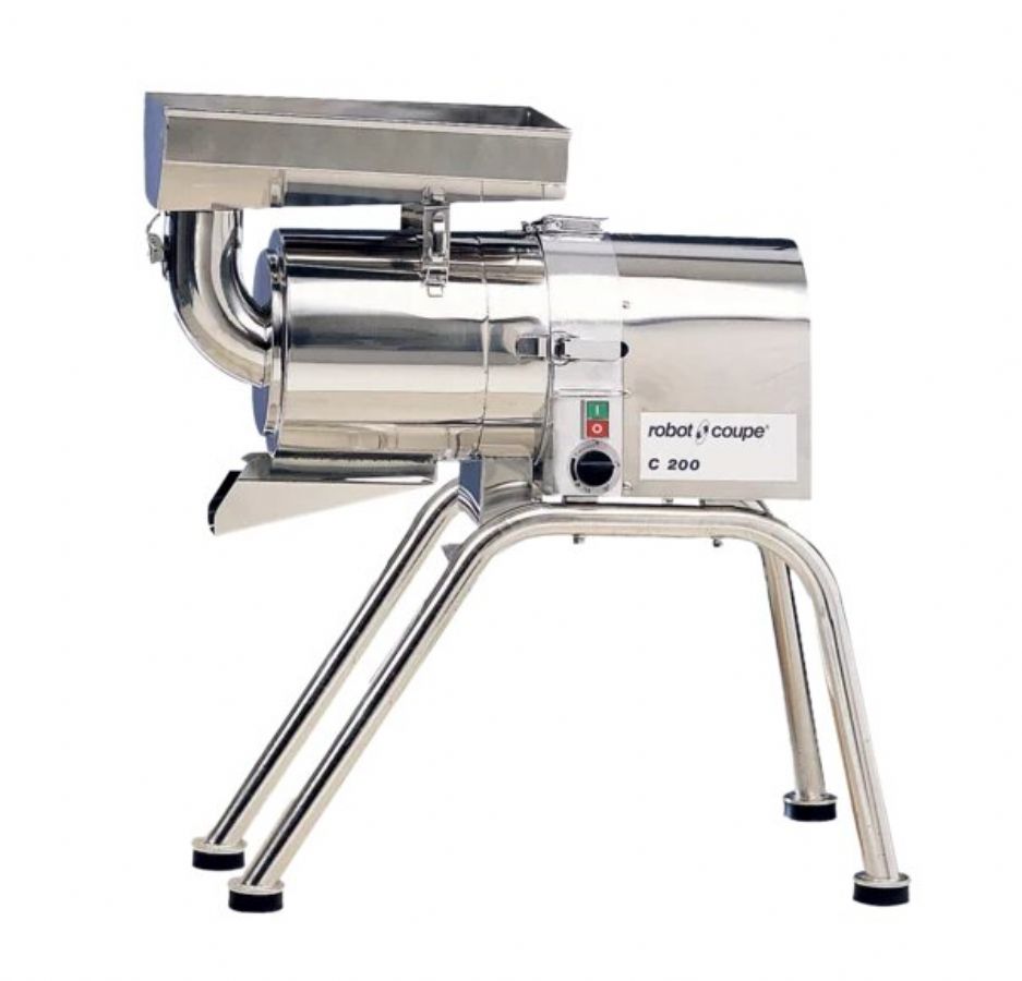 En ce qui concerne les spécificités techniques, ce modèle C200 Spécial industrie est doté d'un moteur asynchrone triphasé et d'une éjection des déchets en continu, offrant résistance et durabilité maximisées. Sa conception permet l'introduction continue des produits, ce qui assure une souplesse pour répondre aux imprévus culinaires.