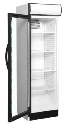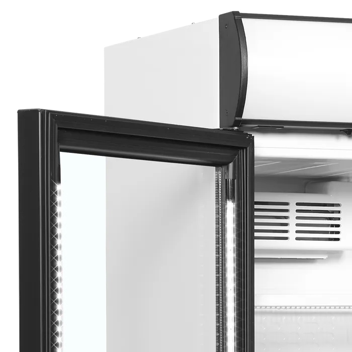 Porte vitrée à charnières côté gauche, Excellente présentation des produits, Canopée lumineux, Convient parfaitement au branding, Éclairage LED dans le cadre de la porte, Tablettes ajustables, Refroidissement par ventilateur