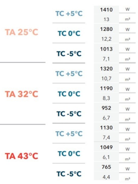 Pour une température ambiante de 20 °C, le volume est de 20,8 m3 à +5°C, 16,6 m3 à 0°C, et 12,4 m3 à -5°C. À 32 °C, il est de 16 m3 à +5°C, 11,7 m3 à 0°C, et 9,1 m3 à -5°C.
