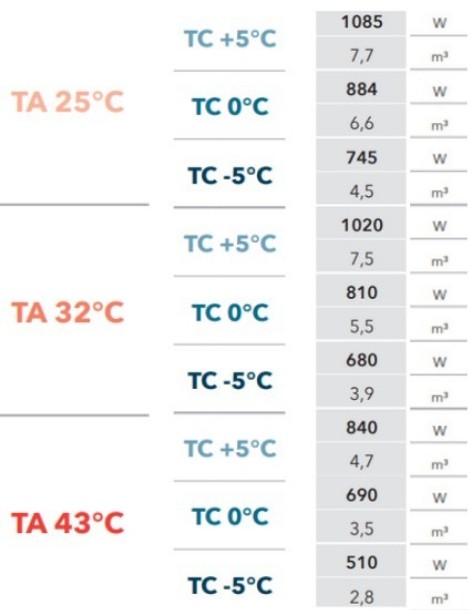 Pour une température ambiante de 20 °C, le volume est de 11,6 m³ à +5 °C. Pour 32 °C, c'est 9,7 m³ à +5 °C, et pour 43 °C, c'est 6,6 m³ à +5 °C.
