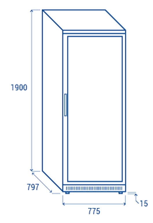 Porte : Vitrée Nombre d'étagères : 4+1 Dimensions extérieures (LxPxH) (mm) : 775x763x1900 Dimensions intérieures (LxPxH) (mm) : 635x572x1638 Capacité (L) : 600 Température : +2° / +8°
