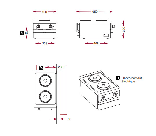 Fourneau professionnel électrique triphasé 2 zones de cuissons à poser - 400x600x290 mm