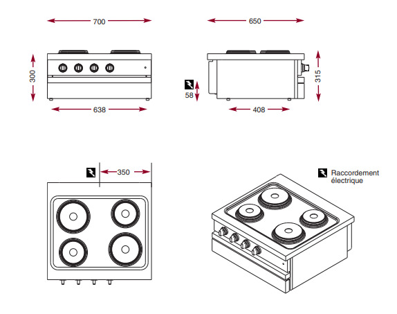 Cuisinière électrique professionnelle à poser 4 plaques de cuisson - 700x650x295 mm
