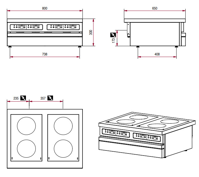 Cuisinière électrique 4 plaques à induction à poser - 800x650x300mm