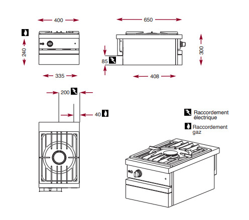 Cuisinière à gaz 1 bruleur vif 7 kW à poser - 400x650x300 mm