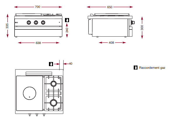Puissance : 2x3 kW brûleurs, 1x5 kW plaque