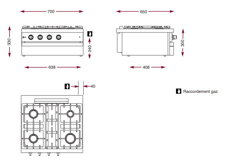 | Puissance des brûleurs/plaques (kW) | 2x3 + 1x4 + 1x1,5 |