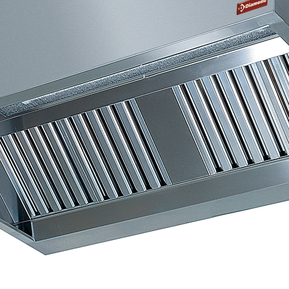 La hotte Diamond Promo s'illustre par sa conception en acier inox AISI 441, renvoyant immédiatement l'image d'un matériel testé par des experts. Dotée de 2 filtres ANTI-GRAISSE à labyrinthes, et d'une turbine centrifuge étanche (IP55) incorporée, elle garantit un fonctionnement performant et une durabilité exceptionnelle. Elle intègre également une goulotte pour la récolte des graisses avec robinet de vidange, facilitant ainsi l'entretien régulier.
