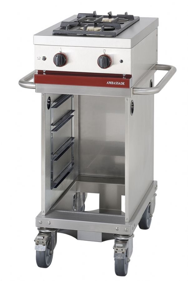 Découvrez la performance avec notre cuisinière à gaz professionnelle, le fourneau à gaz 2 feux vifs sur chariot de la marque AMBASSADE DE BOURGOGNE. Conçu pour les chefs exigeants, cet appareil de cuisson sur chariot combine à merveille tradition et innovation, offrant une réactivité au service de vos attentes.