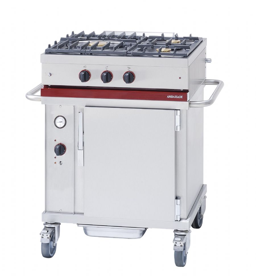 Cuisinière à gaz 3 bruleurs vifs sur four à convection électrique sur roulettes