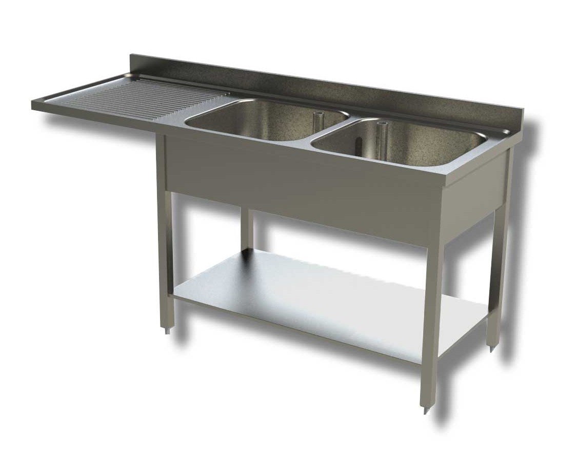 Évier inox sur piètement avec tablette basse 2 bacs à gauche 1800x600 mm