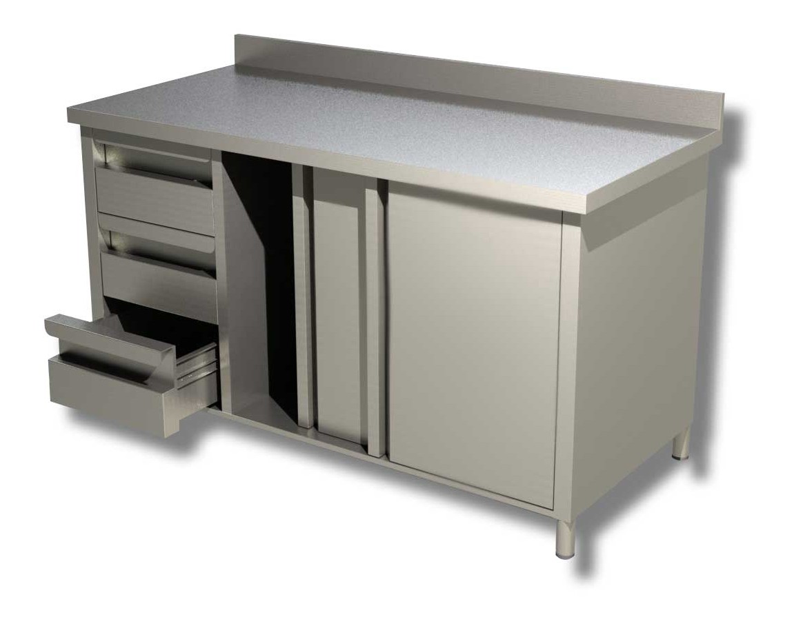 Meuble bas de rangement inox 430 adossé avec 2 portes coulissantes et 3 tiroirs