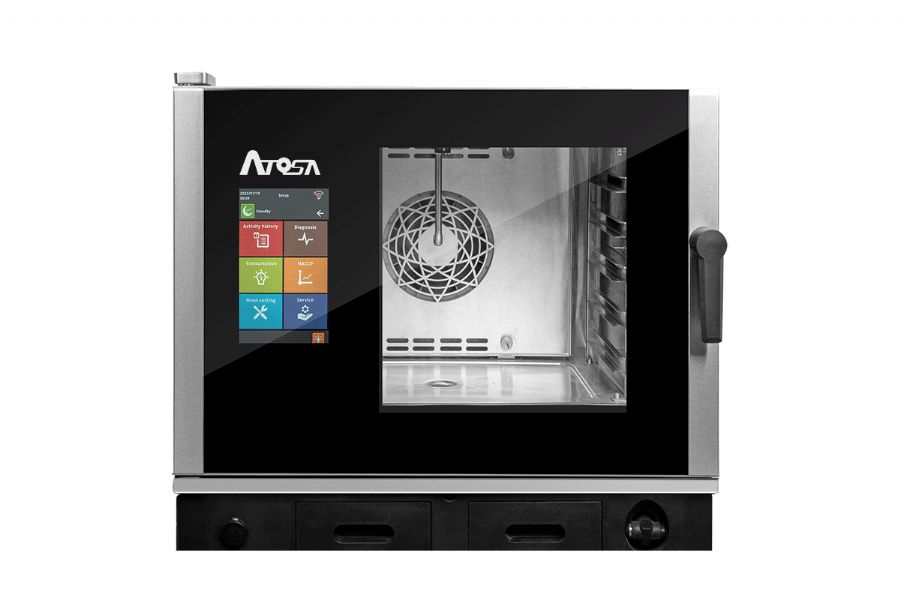 La force de ce four mixte Atosa, c’est son côté réglages manuels, très apprécié quand le personnel tourne ou n’est pas ultra formé. Trois boutons, une lecture immédiate, pas de menus complexes : en service continu, on gagne en réactivité. La plage de température de 30°C à 230°C permet de couvrir la majorité des cuissons en restauration commerciale : basse température de nuit, régénération douce en début de service, puis rôtis, gratins, poissons et finitions au plus fort. La puissance électrique de 8,5 kW à 380 V – 10,1 kW à 415 V assure une montée en chauffe rapide et une bonne reprise de température à l’ouverture répétée de la porte, point clé quand on enchaîne les plaques. Sur une ligne chaude bien pensée, ce four devient le cœur du poste, capable de sécuriser la cadence de service sans sur-solliciter le reste du matériel.