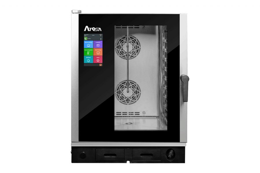 Sur le terrain, ce four mixte prend tout son sens dans un restaurant traditionnel, une brasserie, un hôtel-resto ou une petite collectivité qui cherche un vrai outil de production central. Avec ses 10 niveaux GN 1/1, on peut organiser une cuisson en séquences : rôtis en haut, garnitures en bas, régénération d’assiettes pendant le coup de feu, le tout dans une plage de 30°C à 230°C qui couvre la majorité des usages cuisson et finition. En préparation du matin, il permet de lancer les cuissons longues, les gratins et les légumes rôtis, puis de basculer en mode régénération ou maintien pour le service continu. Les dimensions du four Atosa EPC-1011E2 facilitent son intégration sur un mur chaud déjà chargé, avec un accès simple pour le personnel, même dans une cuisine où chaque centimètre compte.