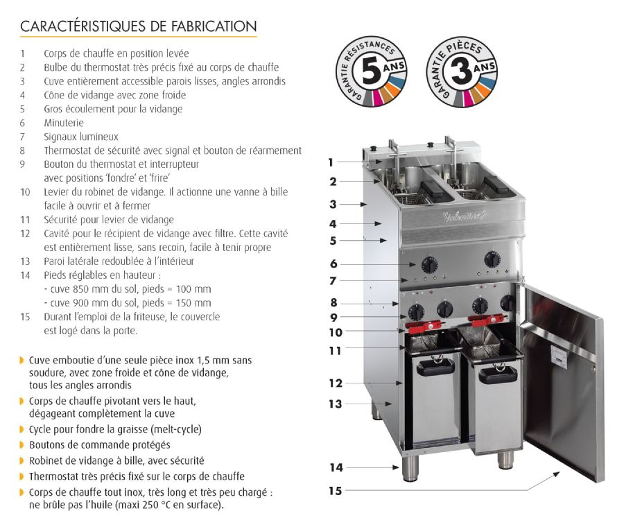 La friteuse EVO250, référence EVO250, fonctionne en Tri 400 V + N + T pour une puissance de 7,2 kW. Sa cuve inox emboutie monobloc sans soudure limite les risques de fuite et simplifie le nettoyage. Le corps de chauffe inox pivotant vers le haut laisse un accès total à la cuve, tandis que la zone froide et le cône de vidange prolongent la durée de vie de l’huile. Les pieds réglables de 850 à 900 mm (roulettes en option) permettent une intégration parfaite dans votre ligne de cuisson, dans le plus strict Respect des délais d’ouverture ou de rénovation.