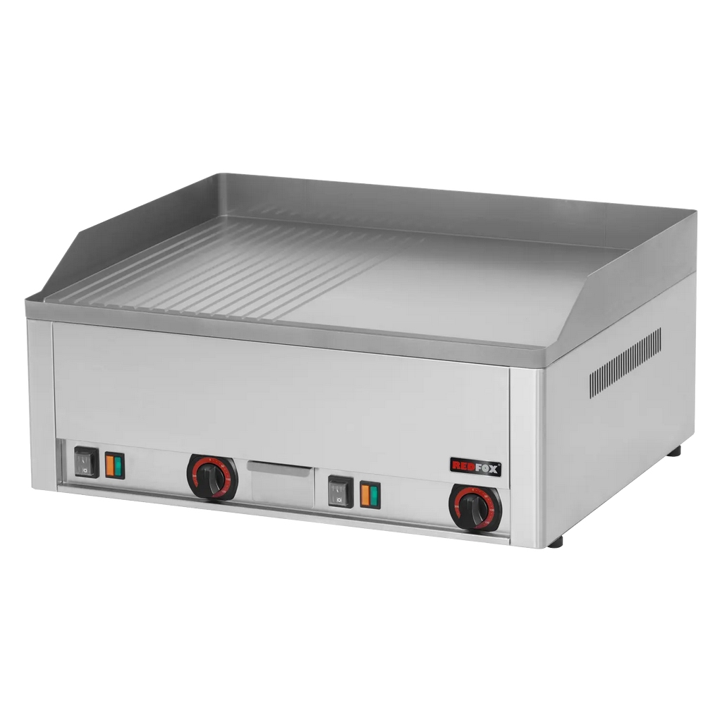 Dans beaucoup de cuisines, le vrai problème sur une plaque à snacker, c’est la perte de puissance et les zones froides dès que l’on charge la surface en plein coup de feu. Sur la REDFOX FTHR 60 E, plaque à snacker électrique de comptoir mixte 6 kW, la plancha de 650 x 480 mm en AISI 430 avec 10 mm d’épaisseur limite ce risque et assure une distribution uniforme de la chaleur. Avec une plage de 50 à 300 °C, vous pouvez enchaîner saisie de viandes, légumes et poissons sans jouer en permanence avec le thermostat, ce qui sécurise la cadence de service et la constance de cuisson.