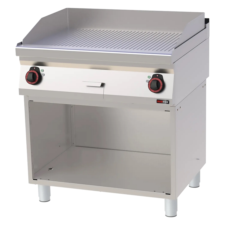 Plaque grill triphasé professionnelle 1 zone lisse 1 zone rainurée sur coffre ouvert - 800x700x850 mm