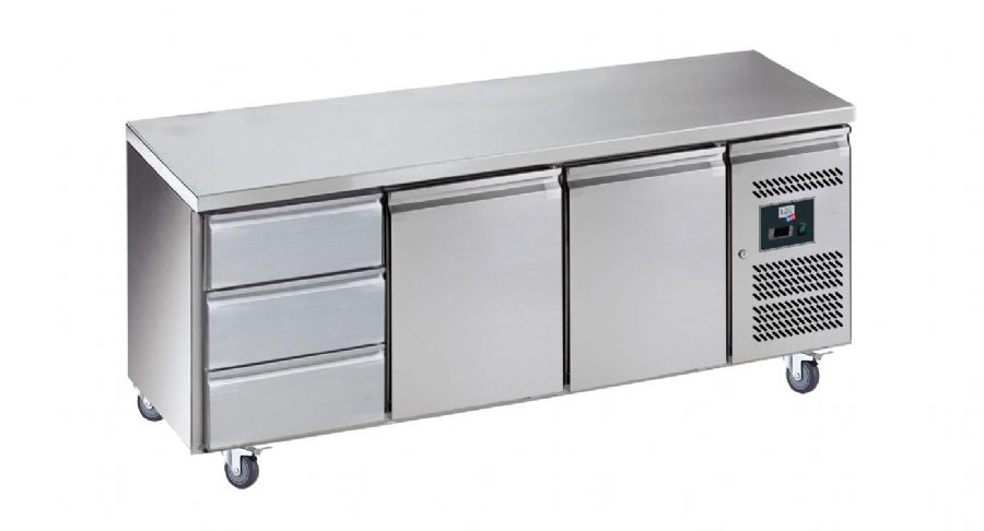 Table desserte réfrigérée inox centrale -2/+8°c avec 2 portes et 3 tiroirs