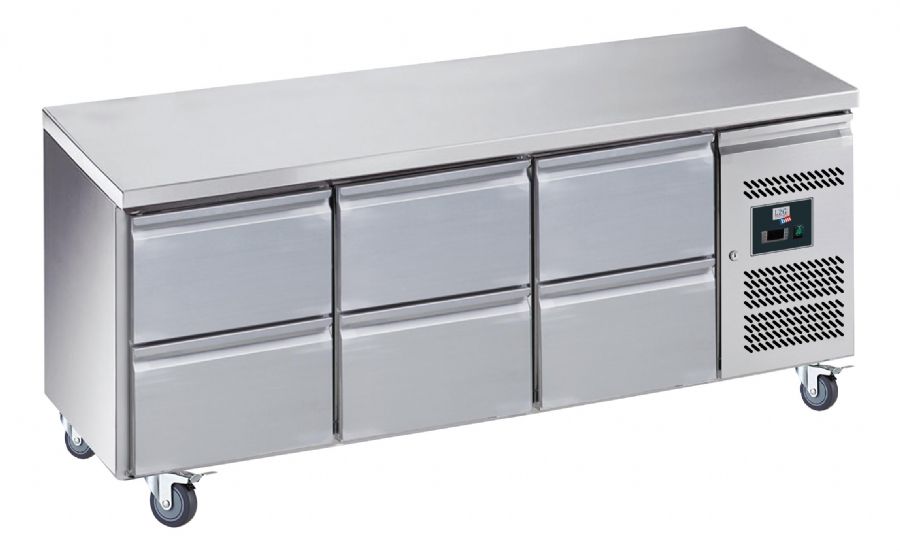 Table desserte réfrigérée inox centrale -2/ +8°C avec 3 compartiments de 2 tiroirs chacun - 465 litres