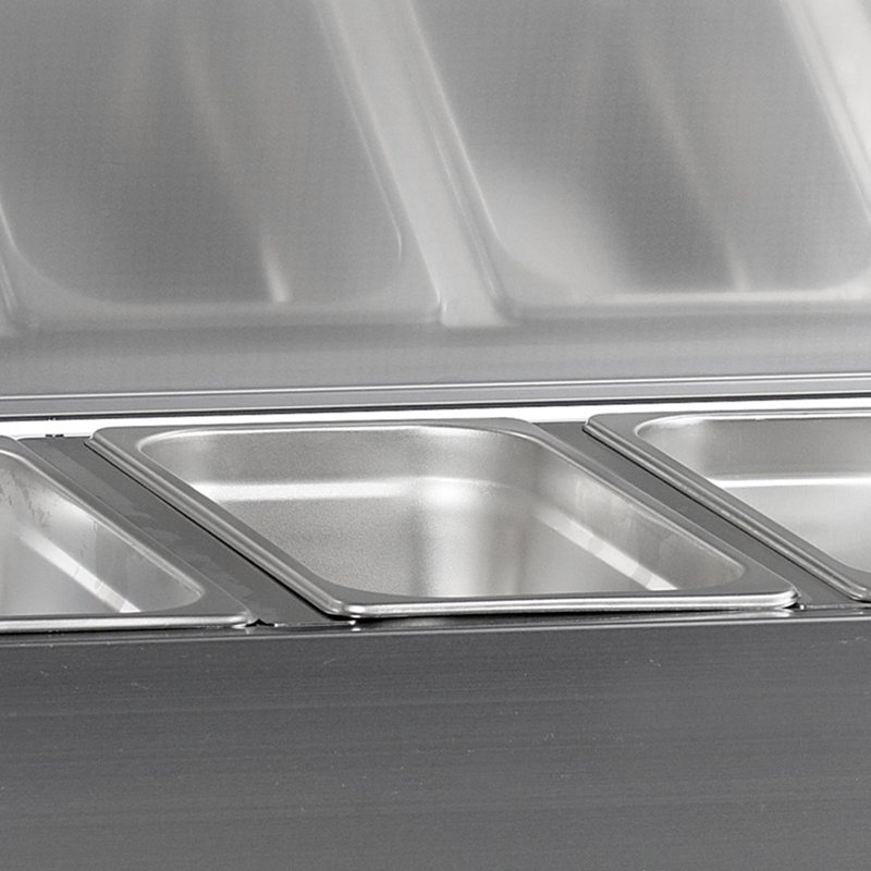 Les avantages pratiques de ce meuble incluent une utilisation efficiente de l’espace, parfaite pour les pizzérias, fast-foods et sandwicheries, permettant d'avoir tous les ingrédients à portée de main sans sacrifier la qualité ni l'esthétique. Son couvercle en acier procure une protection optimale pour les aliments.
