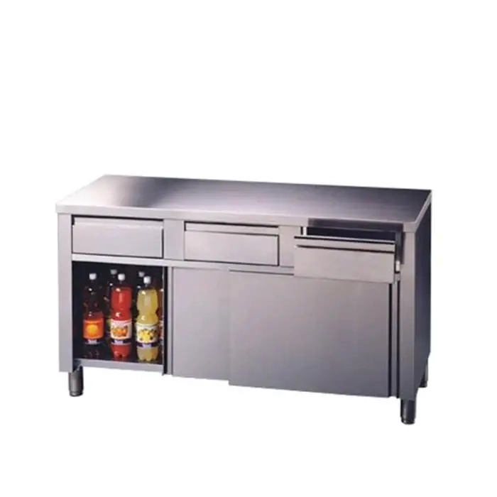Table armoire neutre en inox avec 4 tiroirs alignés horizontalement et 2 portes coulissantes 2000x600 mm