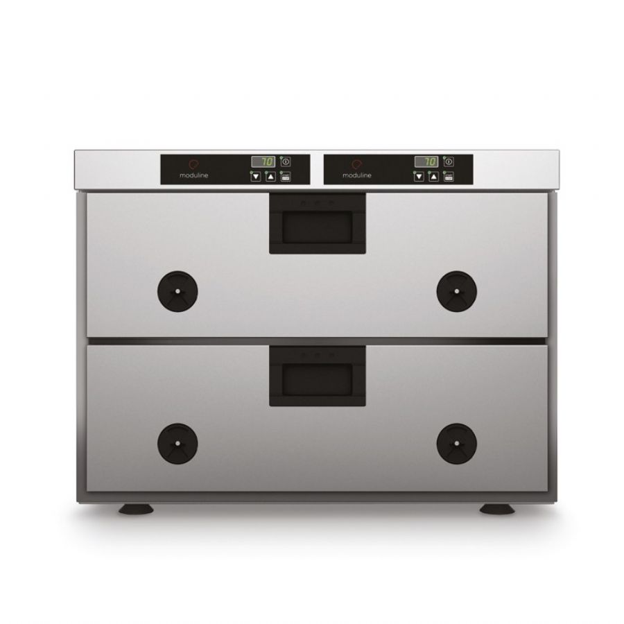 Conçu pour les cuisines les plus exigeantes, le tiroir de maintien au chaud Moduline Référence HSW212E apporte une solution de remise et maintien en température haut de gamme aux brigades qui recherchent régularité et réactivité au coup de feu. Avec ses deux bacs GN 1/1 profondeur 150 mm et son panneau de commande indépendant, il offre une Valeur ajoutée à chaque produit servi, tout en optimisant l’organisation du passe.