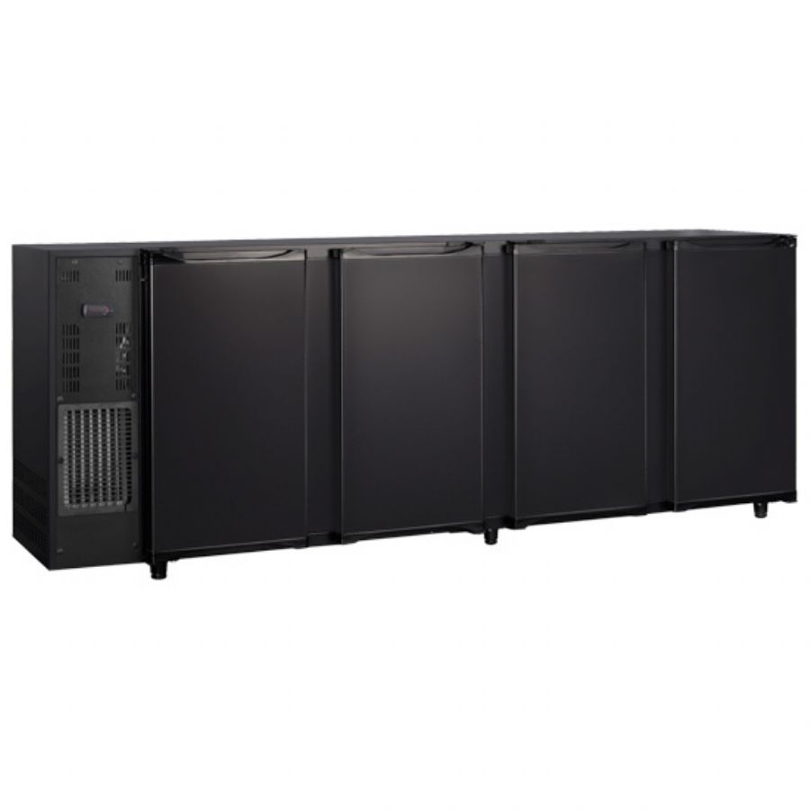 Arrière de bar professionnel noir avec 4 portes pleines vitrées et 8 étagères inox - 2542x513x860