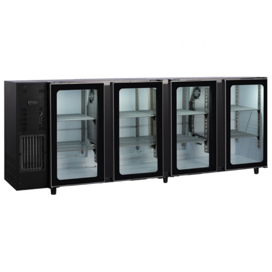 Arrière de bar professionnel noir avec 4 portes pleines vitrées et 8 étagères inox - 2542x513x860