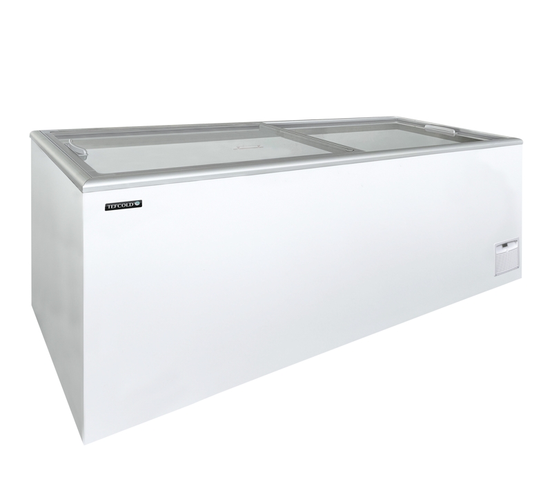 Congélateur vitrine îlot de supermarché blanc avec 2 couvercles coulissants plats 652 L - 2050 x 960 x 780 mm