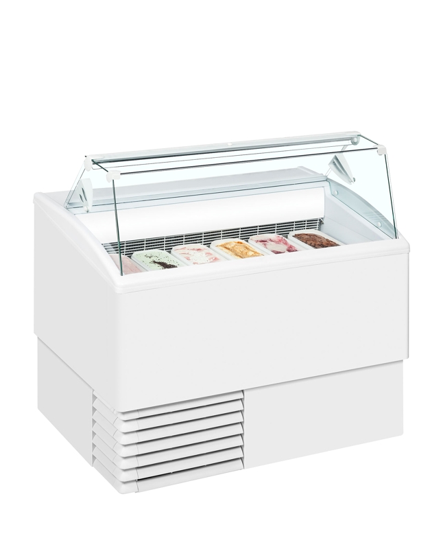 Vitrine à glaces avec couvercle en verre plat - température -16/-14°CISA jouit d'une grande renommée dans le secteur de la glacerie pour la conception de vitrines haut de gamme. L'Isetta ST est proposée en 3 formats distincts pour satisfaire la majorité des exigences, permettant d'accueillir entre 4 et 7 parfums de glace. Une structure vitrée plate et un illumination intérieure aident à produire une exposition séduisante et à valoriser au mieux les glaces que vous proposez. La zone de réserve frigorifique est aisément accessible via le portillon arrière (sauf pour le modèle 4ST).