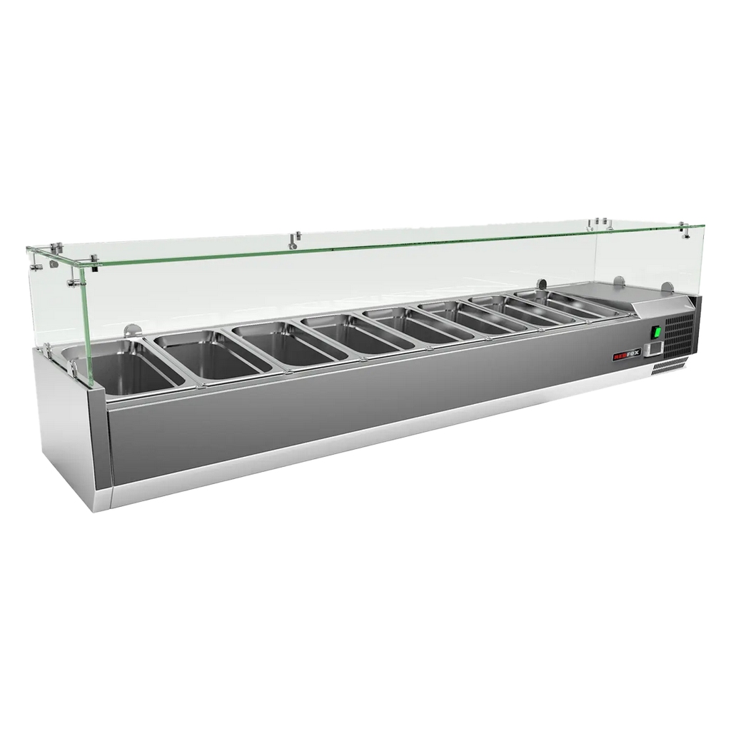 Dans beaucoup de cuisines pro, le problème récurrent avec les vitrines de comptoir, c’est la gestion de la température en service continu : bacs mal refroidis, zones inégales, affichage peu lisible, appareils difficiles à intégrer sur un bar déjà saturé. La vitrine réfrigérée de comptoir en acier inoxydable pour 8 bacs GN 1/3 hauteur REDFOX MCH 3180 répond à ces points avec une longueur de 1800 mm bien adaptée à un comptoir de pizzéria, de snack ou de sandwicherie, tout en restant compacte (395 mm de profondeur) pour préserver le confort de travail côté passe. Le froid statique de 2 à 8 °C, réglé par un contrôle digital, assure un maintien produit stable si le couvercle est bien géré par l’équipe.