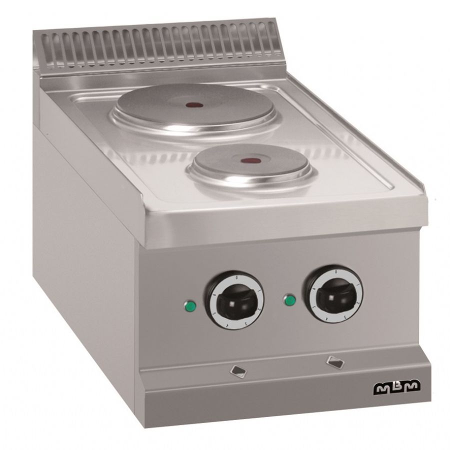 Cette cuisinière est équipée de deux plaques électriques : une de 2,6 kW et une de 1,5 kW, pour une puissance totale de 4,1 kW. Fonctionnant sous 400 Volt, elle se distingue par sa personnalisation des solutions : idéale pour les restaurants aux espaces réduits nécessitant une cuisson variée et rapide.