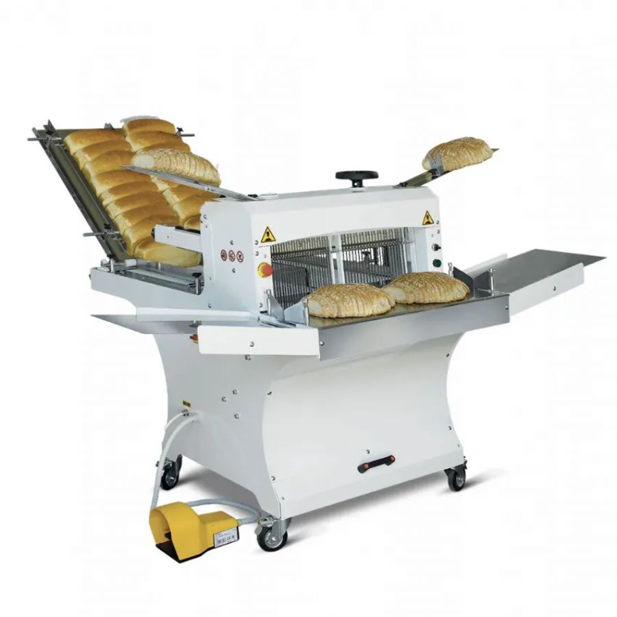 L'innovation majeure de ce modèle réside dans la configuration de son système de coupe. Les cadres de lames sont divisés en deux sections distinctes, permettant d'intégrer deux épaisseurs de tranches différentes sur la même machine (par exemple : une moitié réglée à un pas de 10 mm pour les pains de mie, et l'autre moitié à 14 mm pour les pains rustiques). Cette polyvalence supprime la nécessité d'investir dans deux trancheuses séparées et élimine les temps d'arrêt liés aux changements de machines ou de cadres.